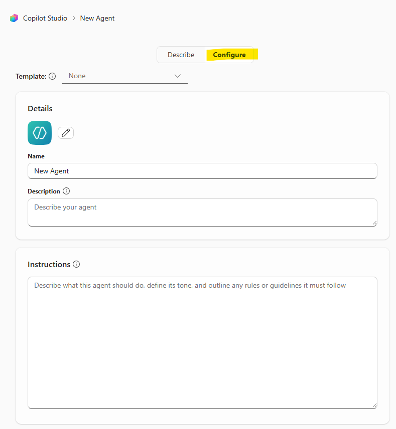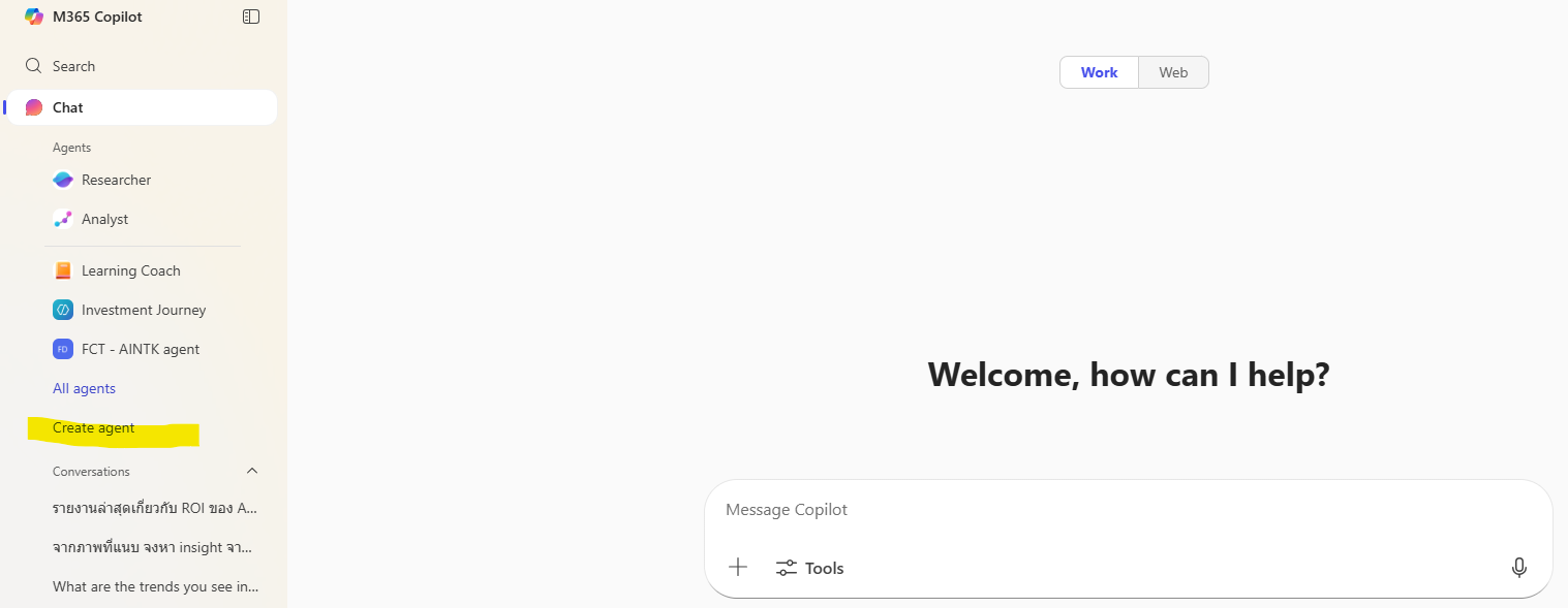 ขั้นแรก คือการเลือก Menu ‘Create Agent’ ใน Microsoft M365 Copilot ซึ่งจะมีเฉพาะใน Enterprise edition เท่านั้น (personal account ไม่มีเมนูนี้)