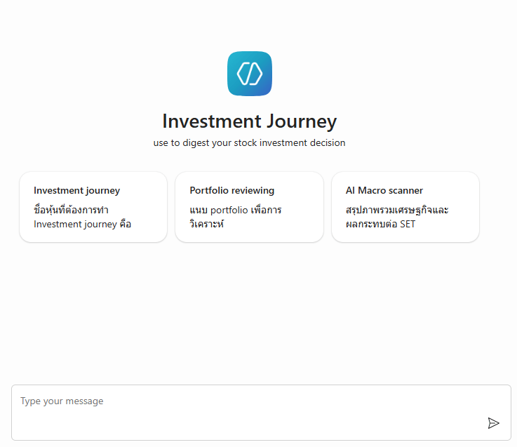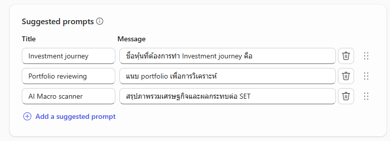 ขั้นตอนสุดท้าย สร้าง Suggested Prompts menu เพื่อที่เวลาใช้จะไม่ต้องมานั่งพิมพ์คำสั่งลงใน chat ทุกครั้ง ผมสร้างเมนูไว้ 3 เรื่อง คือ Investment journey ไว้สรุปบทเรียนตอนตัดสินใจขาย, Portfolio review ไว้ให้ AI ช่วยดูภาพรวมของพอร์ตเวลาผมซื้อหุ้นใหม่เพิ่มเข้ามา และสุดท้าย Macro scanner ใช้สำหรับเวลาก่อนซื้อหุ้นตัวใหม่โดยให้ AI สรุปภาพรวมเศรษฐกิจก่อนจะโฟกัสมาที่หุ้นที่ผมสนใจจะลงทุนว่าผมมี Bias ในการเลือกหุ้นหรือไม่