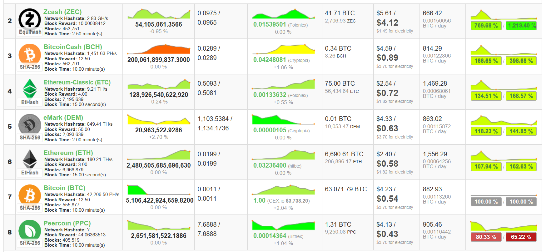 โดย column ที่ 3 นับจากทางขวามือคือมูลค่าที่สามารถทำกำไรได้ต่อวัน เมื่อเทียบกับหน่วยค่าไฟมาตรฐาน ส่วนเหรียญที่ขุดแล้วขาดทุนจะแสดงให้เห็นเป็นตัวสีแดงใน column นี้ ส่วน column ที่ 2 นับจากขวามือ จะบอกว่าต้องใช้เวลากี่วันถึงจะขุดได้เหรียญมูลค่าเท่ากับจำนวน 1 Bitcoin ใช้ง่ายและสะดวกดีใช่ไหมครับ
