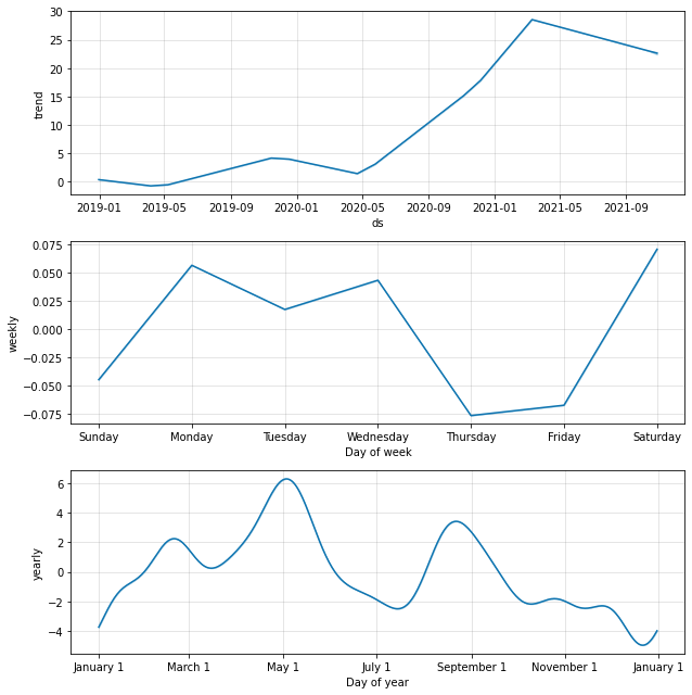 แน่นอนเราต้องอยากเห็นผลลัพธ์แสดงบนหน้าจอ โดยที่เราสามารถให้ระบบทำการ plot กราฟด้วยคำสั่งข้างล่างนี้ และที่ผมชอบมากคือ prophet สามารถแสดงกราฟ seasonal trend เป็น component ของระยะเวลาได้ด้วย โดยการใช้คำสั่ง model.plot_components() ทำให้เราสามารถวิเคราห์เทรนข้อมูลได้ละเอียดแบบรายวัน, รายสัปดาห์ และรายปี เลย
