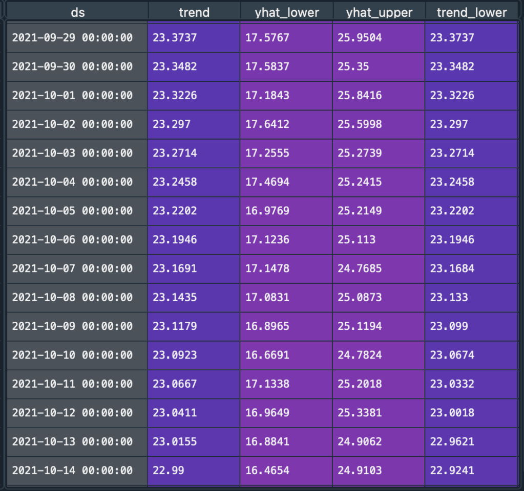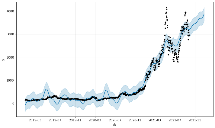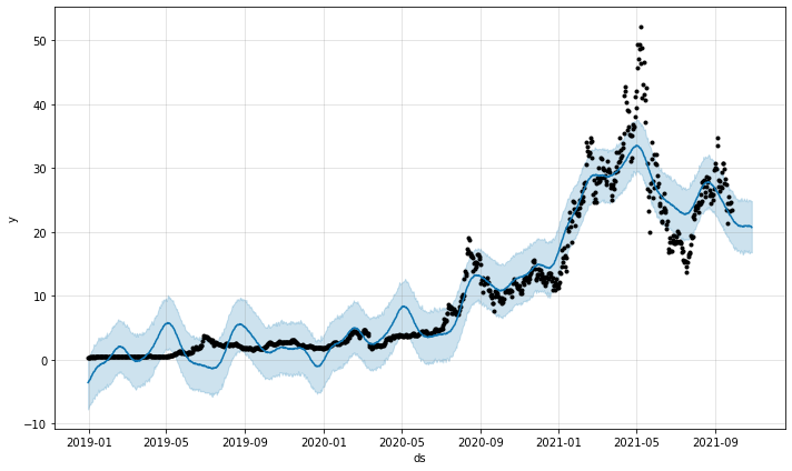 จากนั้นก็เรียกใช้ model prophet ได้เลย ด้วยการแปลงข้อมูลแล้วก็ระบุระยะเวลาการทำนายราคาในอนาคต โดยผมจะขอทำนายล่วงหน้าไป 30 วัน แล้วก็ใช้คำสั่ง predict ให้ prophet ทำนายราคา เท่านี้ก็เป็นอันเสร็จกระบวนการ