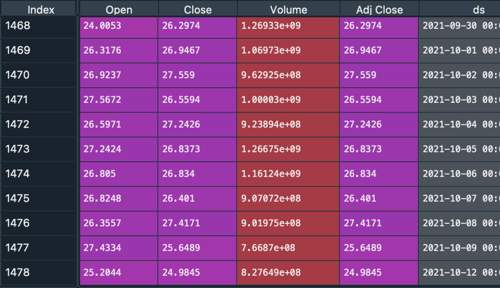 ขั้นตอนที่สำคัญหลังจากได้ข้อมูลมาแล้ว คือการแปลงข้อมูลให้อยู่ในรูปแบบที่ fbprophet ต้องการ คือ มีเพียงแค่ 2 columns โดย column แรกจะเป็นข้อมูลวันที่โดยใช้ชื่อ column ว่า ‘ds’ ส่วน column ที่สอง เป็นข้อมูลราคาที่ต้องการทำนาย โดยเราจะใช้ราคา Adj Close โดยใช้ชื่อ column ว่า ‘y’ มาเก็บไว้ในตัวแปร data frame (df)