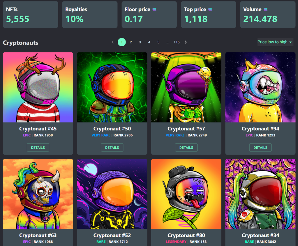 หลังจากที่เราตัดสินใจได้แล้วว่าจะเลือกซื้องานของเธอ ขั้นตอนแรก คือเราจะซื้อตัวไหน ราคาเท่าไหร่ดี? จากรูปตัวอย่างใน Marketplace ด้านบน เราจะเห็น Floor price อยู่ที่ 0.17 SOL หมายความว่า รูป NFT ทั้งหมดที่ขายได้จนถึงปัจจุบัน ราคาซื้อขายต่ำที่สุดอยู่ที่ 0.17 SOL (โดยส่วนมากจะหมายถึงงาน NFT ที่มี Rarity score ต่ำที่สุดที่ขายได้ ณ ขณะนั้น ซึ่งมาจากผู้ซื้อทั้งหมด) ถึงจุดนี้จะทำให้เราทราบราคาคร่าวๆของโครงการนี้แล้วว่าไม่ควรซื้องานเกินไปจากราคา 0.17 SOL มากนัก โดยแต่ละรูปจะมีการระบุตำแหน่งว่า ค่า Rarity Score ของภาพนั้นๆจัดอยู่ในอันดับที่เท่าไหร่ของ NFT ทั้งหมด 5,555 ภาพ
