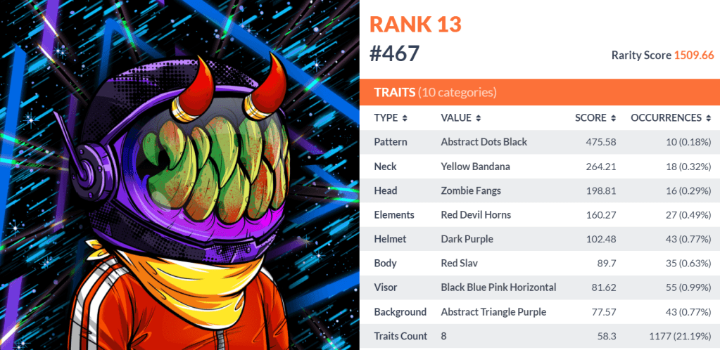 ถ้าเราลองใช้ Rarity score tool ในการเช็คค่าความเป็นเอกลักษณ์ของแต่ละชิ้นงาน ในที่นี้ผมลองใช้เวปชื่อ raritysniper.com ในการเช็ครายละเอียดของ NFT #467 ก็จะเห็นว่างานชิ้นนี้ มีการใช้ pattern แบบ Abstract Dots Black ซึ่งมีอยู่แค่ 10 ภาพ จากทั้งหมด 5,555 ภาพ มีการใช้ผ้าพันคอสีเหลืองแบบ Yellow Bandana ซึ่งมีใช้เพียง 18 ภาพจากภาพทั้งหมด ฯลฯ ทำให้ภาพนี้มีความเป็นเอกลักษณ์สูงเป็นอันดับที่ 13 ของภาพทั้งหมด โดยคะแนนรวมอยู่ที่ 1509.66 คะแนน (การคำนวณคะแนนแต่ละเวปไซด์อาจใช้วิธีคำนวณที่แตกต่างกันไป ใช้เป็นแนวทางประกอบการตัดสินใจเท่านั้น)