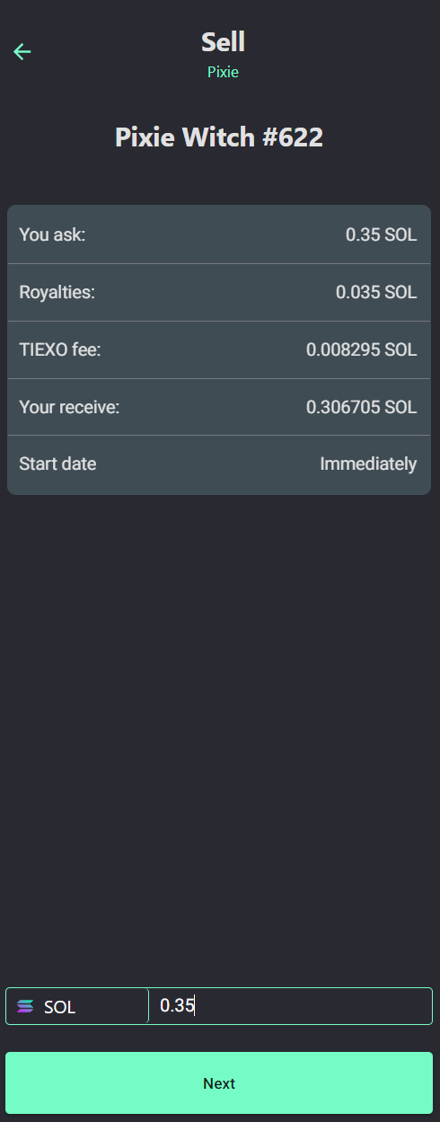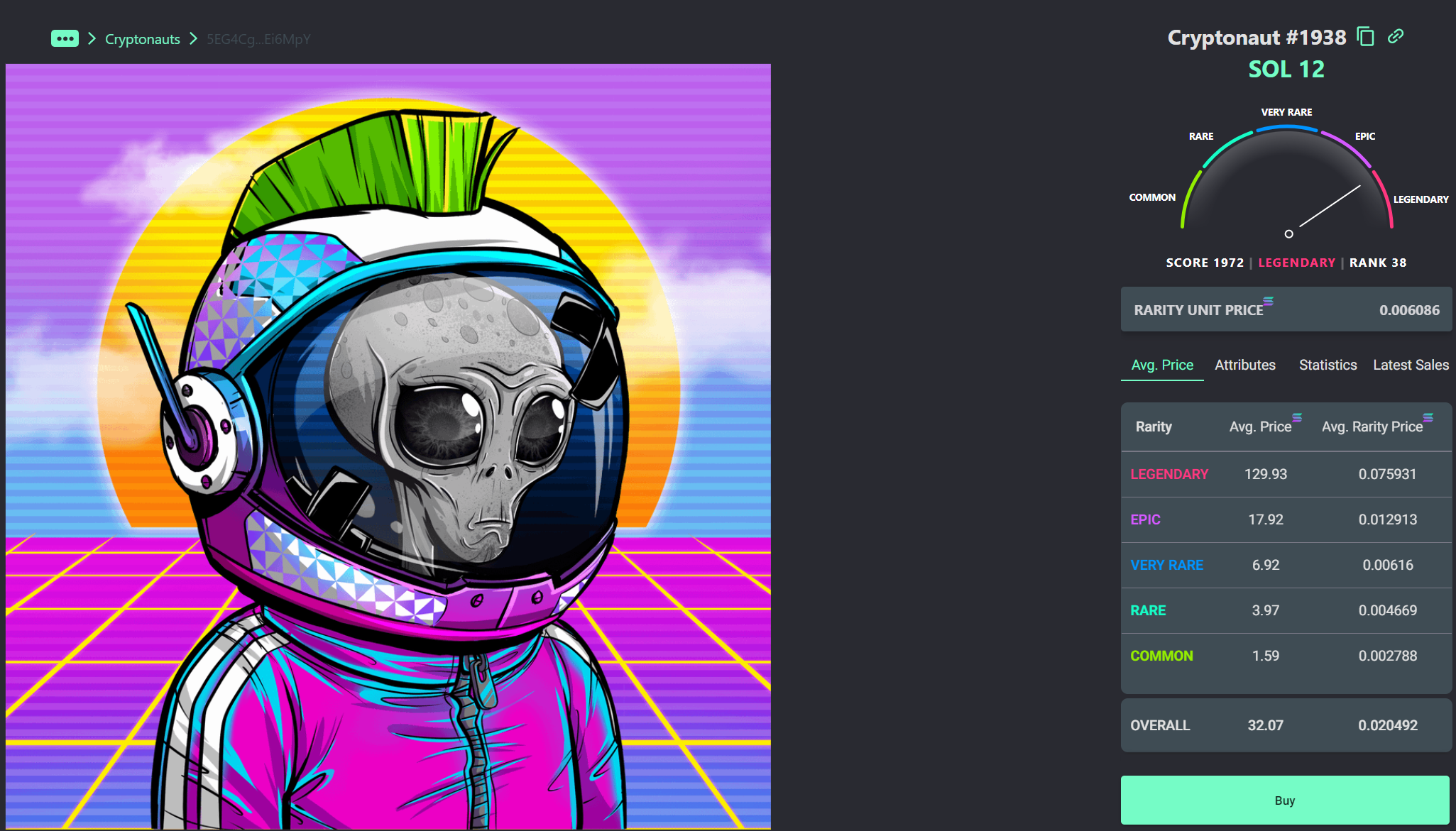 กลับมาดู detail ใน marketplace ซึ่งก็มีการทำ Dashboard เอาไว้ให้อย่างเคร่าๆและยังกำหนด category ของชิ้นงานให้ด้วย เช่น ภาพข้างบนนี้ถือว่าเป็น Rarity ระดับ Legendary (ดูจากเกจวัดระดับขวามือ) ซึ่งจากข้อมูลการซื้อขายทั้งหมด ภาพระดับนี้จะขายได้เฉลี่ยอยู่ที่ 129.93 SOL (ไม่รู้ว่าขายไปได้ทั้งหมดกี่ภาพแล้ว อย่างพึ่งเชื่อในราคานี้) เจ้าของภาพนี้ต้องการจะขายต่อในราคา 12 SOL ซึ่งถ้าค่าเฉลี่ยสามารถคาดคะเนราคาได้จริง เราก็น่าจะขายต่อได้กำไร (แต่ต้องถือไว้นานเท่าไหร่ก็ไม่รู้) dashborad นี้จะช่วยให้เราตัดสินใจเรื่องราคาได้ดีขึ้นในระดับหนึ่ง ซึ่งราคาเฉลี่ยจะน่าเชื่อถือต่อเมื่อมีรายการซื้อขายมากในระดับหนึ่งเท่านั้น อีกปัจจัยที่สำคัญคือ ตลาด NFT เป็นตลาดเก็งกำไร ราคาจะค่อยๆตกลงเมื่อหมดโปรโมชั่น เพราะนักเทรดต้องการเงินไปซื้องานชิ้นใหม่ต่อไป ยิ่งรอนานยิ่งได้ของถูก