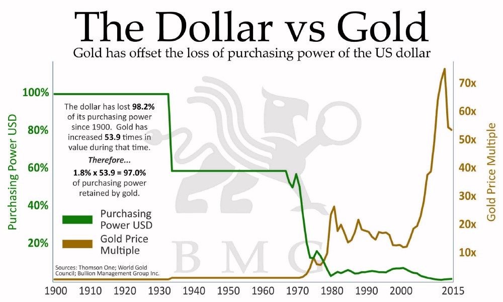 - เมื่อเศรษฐกิจการเงินเฟื่องฟูขึ้นมาก การดูแลทองคำค้ำประกันก็เริ่มทำได้ยาก และเริ่มมีการพิมพ์ตั๋วเงินออกมาจำนวนมากกว่าจำนวนทองคำที่สำรองเอาไว้ นั่นหมายถึง supply ที่ควบคุมด้วยปริมาณทองคำ ไม่สามารถควบคุมได้อีกต่อไป ทำให้ Stock ของเงินหมุนเวียนในตลาดเพิ่มขึ้นมากกว่าจำนวนทองคำสำรองเป็นจำนวนมาก และทุกๆประเทศก็เริ่มทำตามเพื่อที่จะทำให้เศรษฐกิจของประเทศตัวเองสามารถหมุนเวียนและเติบโตได้สะดวกขึ้น ถึงแม้จะต้องแลกกับการด้อยค่าของเงินในทุกๆปีจากนั้นก็ตาม โลกเริ่มเคลื่อนตัวเข้าสู่เงินตรายุคใหม่ที่เรียกว่า เงินของรัฐบาล (Fiat money) และไม่ใช้ทองคำเป็นมาตราฐานระหว่างประเทศอีกต่อไป คือไม่มี Global unit of account อีกต่อไป แต่ละประเทศมี supply เป็นสกุลเงินของรัฐบาลตัวเองแทนทองคำ