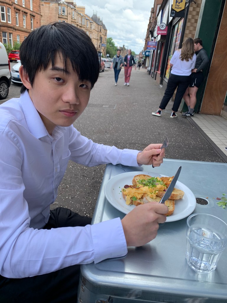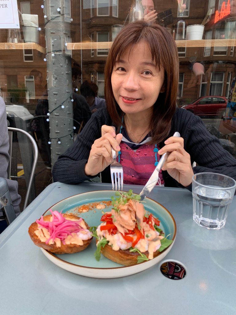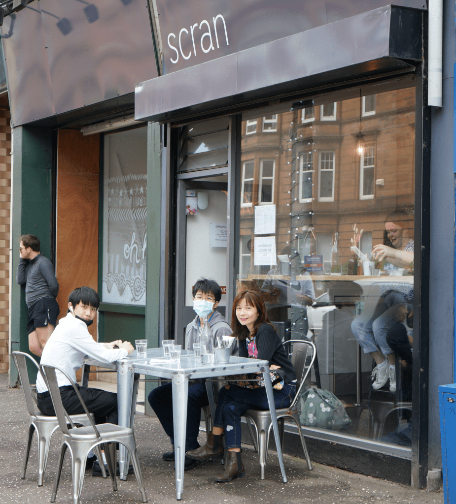 จาก Lime House school ใน Carlisle สู่ Glasgow ใช้เวลาประมาณชั่วโมงนิดๆ เรามาถึงทันอาหารเที่ยงที่ร้าน Scran พอดี ร้านนี้เป็นแฟรนไชส์ที่มีชื่อของ Scotland เป็นร้านอาหารขายพวกเมนูไข่และอาหารบนขนมปังหลากชนิด ร้านนี้คนค่อนข้างเยอะ ส่วนใหญ่จะเข้าคิวซื้อเพื่อกลับไปกินบ้าน ส่วนที่นั่งในร้านก็เต็มหมด ถ้าจะรอกินในร้านก็ประมาณอีกครึ่งชั่วโมง ผมไม่อยากรอและเริ่มหิวแล้ว เลยบอกกับเจ้าของร้านว่าเราไม่ว่าอะไรถ้าจะจัดโต๊ะกินที่หน้าร้าน ทางเจ้าของร้านก็จัดให้ทันที รสชาดอาหารและเมนูถือว่าแปลกใหม่สำหรับเราที่พึ่งมาเยือน Scotland เป็นครั้งแรก ราคาก็ไม่แพงอีกด้วยเพราะอาหารของร้านนี้จัดอยู่ในพวก Quick Bite ที่เราเรียกกันว่า Fast food นั่นเอง
