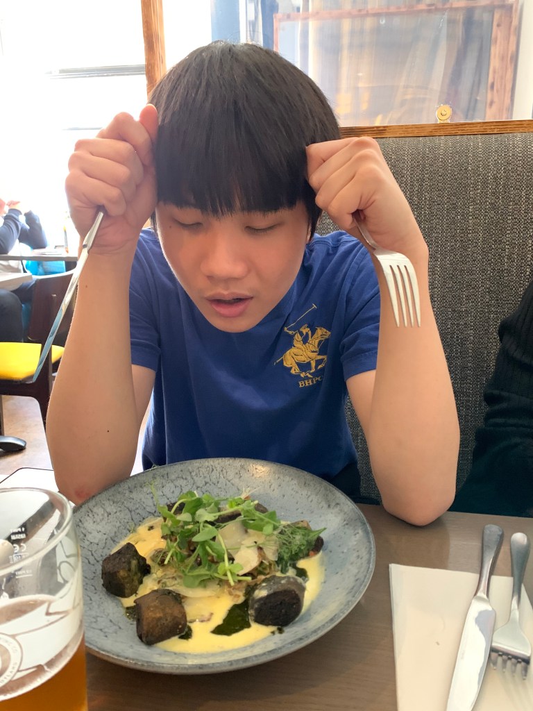 เรามีเวลาเดินเล่นกันถึงแค่ 5:30pm เพราะผมจองร้านอาหารเอาไว้ ชื่อ Fanny Trollopes เป็นร้านอาหาร fine dining แบบสก๊อตแลนด์ ที่ขึ้นชื่อด้านอาหารทะเล ผมเลยสั่งเมนู Chicken Supreme และ Fish of the day ซึ่งไม่รู้คืออะไรสุดแต่เชฟจะรังสรรค์มาให้ ก็อร่อยใช้ได้ทีเดียว ส่วนนาโนสั่งพาสต้าที่มีส่วนผสมของน้ำมันทรัฟเฟิลกับแป้งย่างถ่านอะไรสักอย่าง อยากลองของแปลก ผมลองสั่งเบียร์ IPA ของสก็อตแลนด์มาด้วย ดื่มแล้วสดชื่นมากๆ อาจเป็นเพราะบรรยากาศ วันนี้เป็นครั้งแรกในชีวิตที่นาโนดื่มเบียร์ ติดใจใหญ่เลย เสร็จจากอาหารเย็นเราก็เดินกันต่อไปที่ร้านไอศครีมแถวนั้นเป็นของหวาน ร้านชื่อ Big Licks เป็นเหมือนร้านที่วัยรุ่นมารวมตัวกัน มีไอศครีมให้เลือกหลากหลาย อร่อยดี