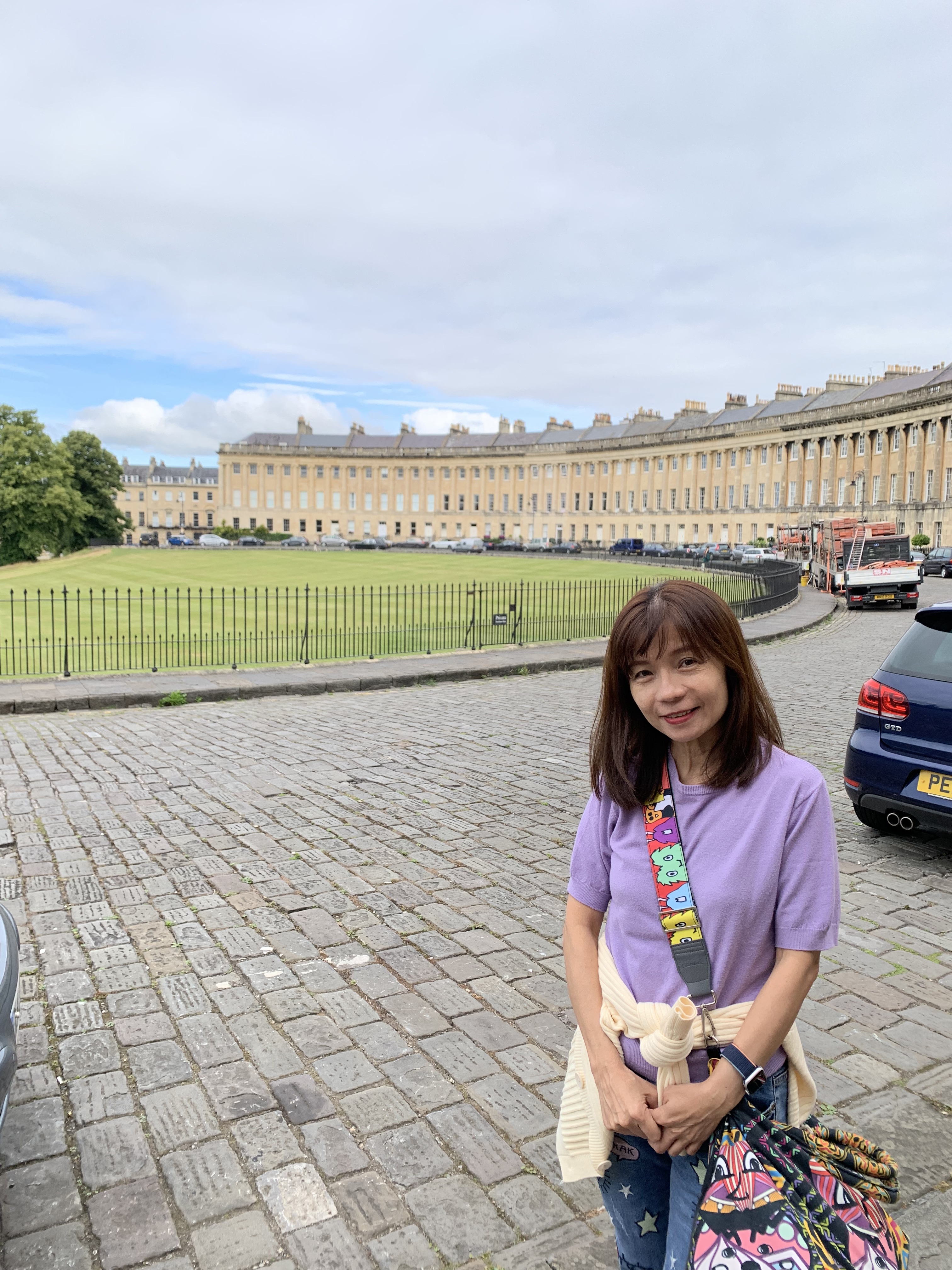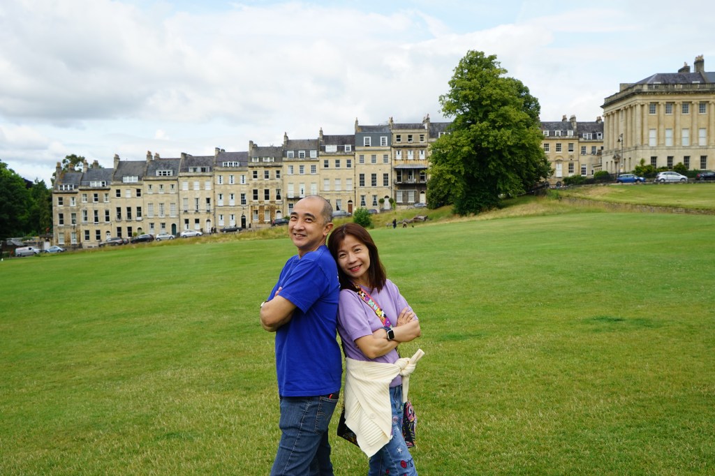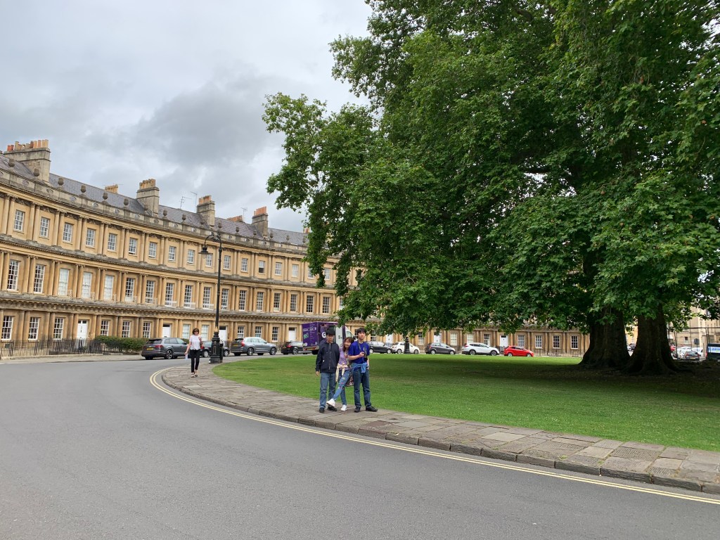 เราเริ่มเที่ยวจากการไปถ่ายรูปที่ Royal Crescent ก่อน เป็นอาคารโค้งออกแบบโดยมีสถาปัตยกรรมแบบจอร์เจีย อยู่ใกล้กับวงเวียน The circle ที่อาคารถูกออกแบบมาให้โค้งรับกับวงเวียนที่มีต้นใม้ใหญ่อยู่ตรงกลาง
