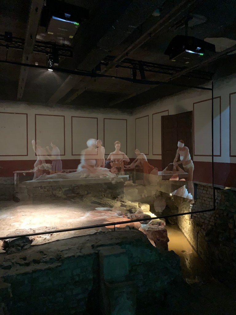 จากนั้นรถของพวกเราจอดส่งตรงหน้า Bath Abbey เพื่อให้พวกเราเดินเข้าไปต่อแถวซื้อตั๋วเพื่อเข้าชม Roman Baths เราคิดว่ามากันเช้าแล้วแต่แถวซื้อตั๋วยาวกว่าที่เราคิด ภายในมีการจัดการอย่างดีมีการแจก Audio tour guide ให้ฟังตลอดการชมสถานที่ มีการใช้ภาพฉายบนกระจก เพื่อให้นักท่องเที่ยวเห็นถึงกิจกรรมต่างๆที่ชาวโรมันชั้นสูงใช้ใน Bath spa club แห่งนี้ วิธีการนำเสนอน่าสนใจทีเดียว