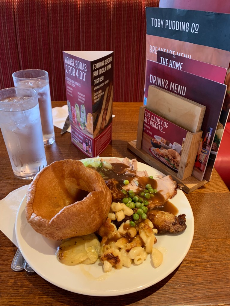 พวกเราเดินไปรอบๆ ถ่ายรูปกันไป หินกลุ่มเดียวก็สามารถสร้างความสุข และสนุกให้กับครอบครัวเราได้อย่างไม่น่าเชื่อ เราถ่ายรูปกับหินกลุ่มนี้เยอะมาก เรียกว่าถ่ายจนคุ้มค่าตั๋วกันเลยทีเดียว หลังจากถ่ายรูปจนเบื่อแล้วก็นั่งรถบัสกลับออกไป และก็ไปหาอาหารเที่ยงกินกันต่อ มื้อนี้เราไปลองอาหารสไตล์อังกฤษที่เรียกว่า English roasts กัน เป็นครั้งแรกในชีวิตที่ผมได้รู้จักกับ Yorkshire pudding ตอนได้ยินแค่ชื่อ ผมนึกว่ามันเป็นขนมหวานเด้งๆ เหมือนขนมพุดดิ้ง พึ่งจะรู้จักน่าตามันก็วันนี้ มันคือปาท่องโก๋สไตล์อังกฤษ ที่ไว้กินกับเนื้ออบนี่เอง ถ้าใครมาดู Stonehenge ผมแนะนำให้มาทานมื้อเที่ยงที่ Toby เป็นร้านอาหาร English Roasts แบบบุฟเฟต์ สามารถตักสลัดได้ไม่อั้นเลย แต่เนื้ออบขอเพิ่มไม่ได้นะครับ ที่สำคัญคืออร่อยมากร้านนี้