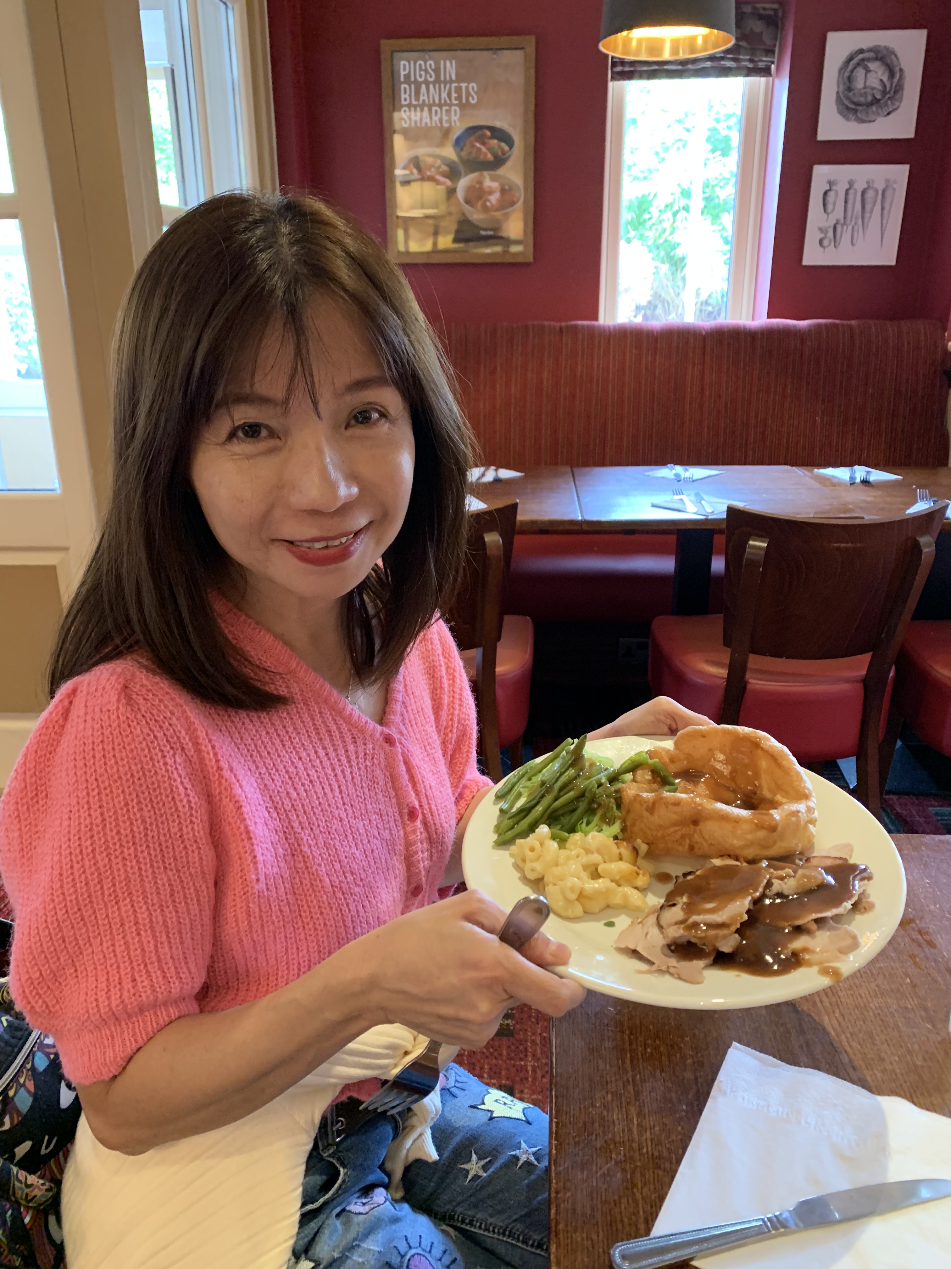พวกเราเดินไปรอบๆ ถ่ายรูปกันไป หินกลุ่มเดียวก็สามารถสร้างความสุข และสนุกให้กับครอบครัวเราได้อย่างไม่น่าเชื่อ เราถ่ายรูปกับหินกลุ่มนี้เยอะมาก เรียกว่าถ่ายจนคุ้มค่าตั๋วกันเลยทีเดียว หลังจากถ่ายรูปจนเบื่อแล้วก็นั่งรถบัสกลับออกไป และก็ไปหาอาหารเที่ยงกินกันต่อ มื้อนี้เราไปลองอาหารสไตล์อังกฤษที่เรียกว่า English roasts กัน เป็นครั้งแรกในชีวิตที่ผมได้รู้จักกับ Yorkshire pudding ตอนได้ยินแค่ชื่อ ผมนึกว่ามันเป็นขนมหวานเด้งๆ เหมือนขนมพุดดิ้ง พึ่งจะรู้จักน่าตามันก็วันนี้ มันคือปาท่องโก๋สไตล์อังกฤษ ที่ไว้กินกับเนื้ออบนี่เอง ถ้าใครมาดู Stonehenge ผมแนะนำให้มาทานมื้อเที่ยงที่ Toby เป็นร้านอาหาร English Roasts แบบบุฟเฟต์ สามารถตักสลัดได้ไม่อั้นเลย แต่เนื้ออบขอเพิ่มไม่ได้นะครับ ที่สำคัญคืออร่อยมากร้านนี้