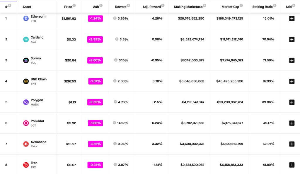 ปรากฏว่าเวปไซท์แบบนั้นมีอยู่จริงครับ มันชื่อว่า https://www.stakingrewards.com เป็นเวปที่รวบรวมเหรียญ stake ทั้งกระดานเอาไว้ ที่สำคัญมีการเปรียบเทียบให้เห็นถึง ผลตอบแทนที่ได้จากการ stake (Reward) และผลตอบแทนที่ปรับมูลค่าแล้วหลังลบค่า inflation และ admin fees อื่นๆ (Adjusted Reward) ทำให้เรารู้ผลตอบแทนที่แท้จริงได้