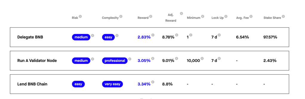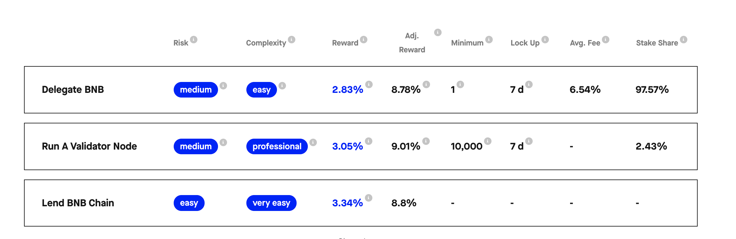 ถ้างั้นเราควรจะ all-in ไปกับ BNB เลยไหม เพราะเป็นเหรียญที่ market cap สูงติด top 10 แล้วยังให้ real yeild สูงอีกต่างหาก ปริมาณที่เหรียญถูกนำไป stake ก็สูงมากถคง 97.93% (staking Ratio) ดูมั่นคงสุดๆ อย่าพี่งรีบตัดสินใจ ถ้าสนใจเหรียญไหนให้คลิ๊กไปที่ชื่อเหรียญนั้นๆ เพื่อเข้าใจถึงรายละเอียดการ Stake เหรียญนั้นๆเสียก่อน ยกตัวอย่างเช่น BNB ถ้า คลิ๊กเข้าไปก็จะทราบรายละเอียดดังภาพ