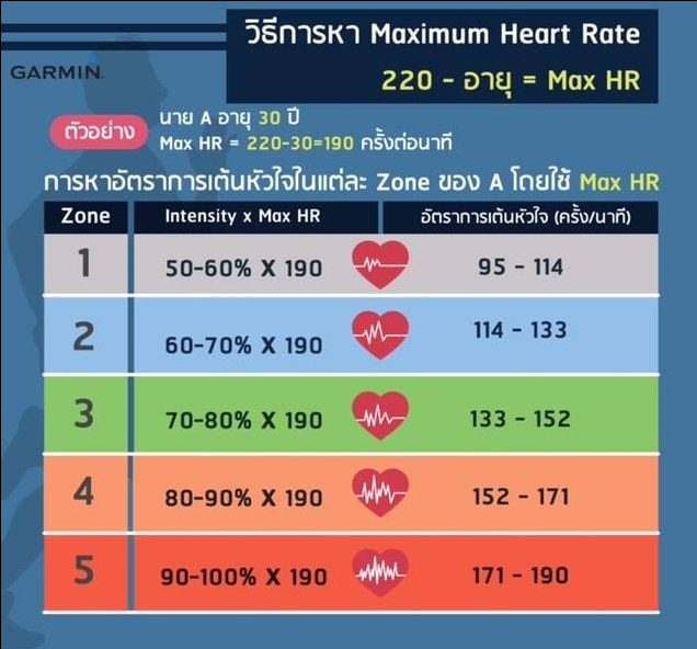 สำหรับพ่ออัตราการเต้นของหัวใจที่ 160 bpm ก็ตกอยู่ใน Zone 5 แล้ว ถ้ามันเกินกว่าที่มีอยู่ในตารางมันคงไม่ดีต่อร่างกายแน่ ๆ และผมไม่อยากรู้ด้วยว่าถ้าอัตราการเต้นเกินกว่าตารางคำนวณเป็นระยะเวลานาน ๆ ร่างกายจะเป็นอย่างไร