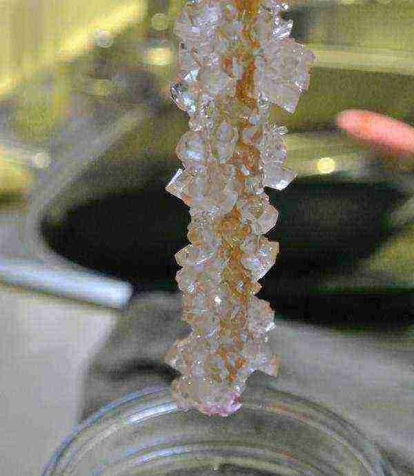 จากนั้นก็เอาเส้นได้ห้อยจุ่มไปกลางภาชนะ พอตกเช้าก็มาดูว่าใครได้ผลึกก้อนใหญ่กว่ากัน